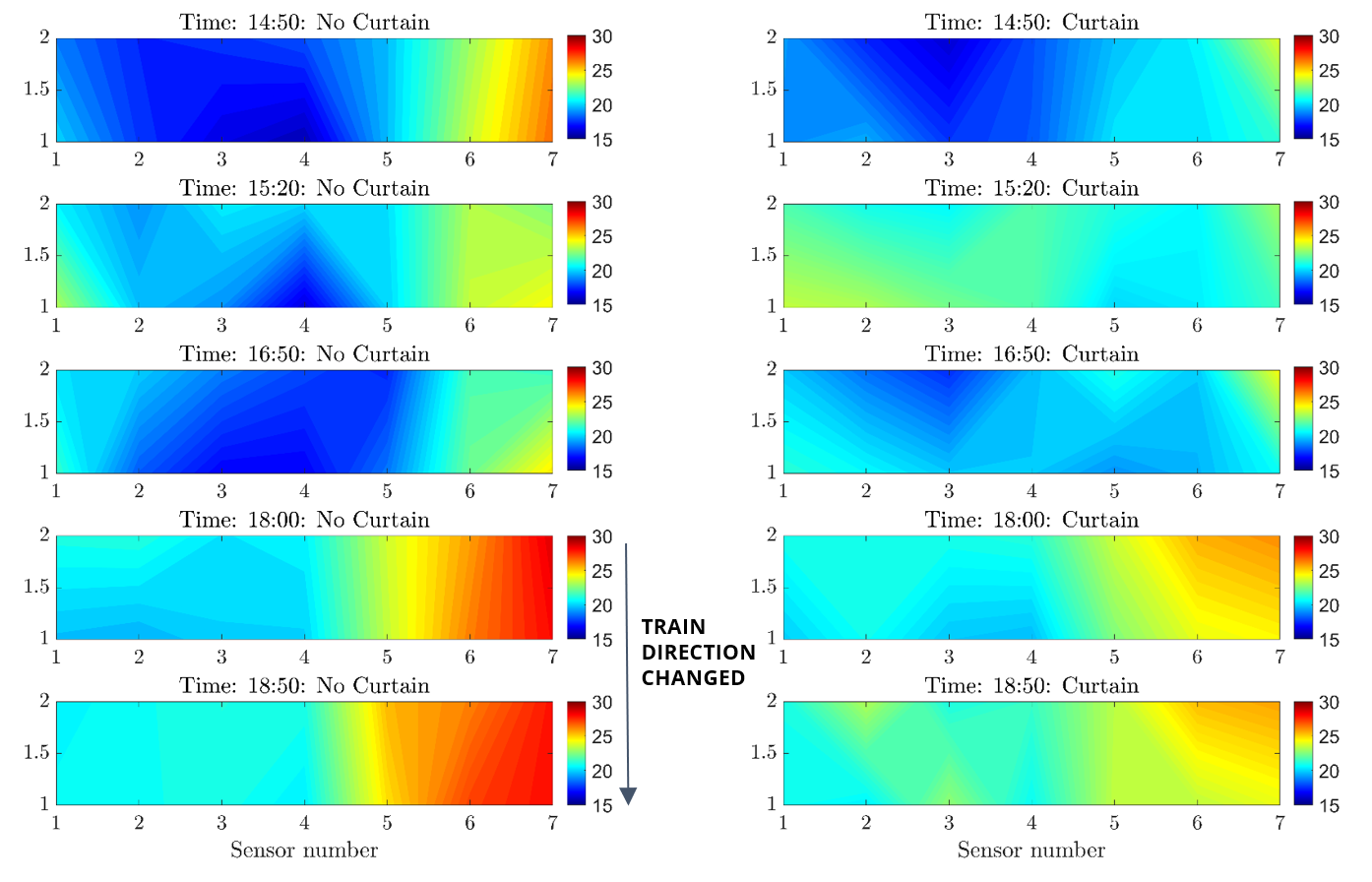 Temperature was measured using 20 thermocouples (accuracy: $\pm$ 1 deg. C), installed at multiple locations along the length and the width of the carriage. Some sensors were also placed vertically to check the presence of stack effect. Indoor air quality (IAQ) was monitored using a low-cost sensor fabricated in-house by Department of Design, IIT Delhi. The figure below shows the comparison of spatio-temporal temperature distribution on the return leg of the journey.